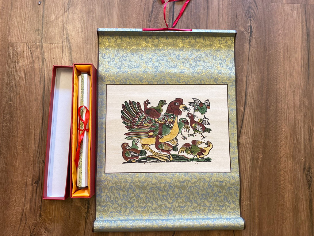 - Tranh Đông Hồ sau khi được in thủ công trên chất liệu giấy dó, rồi bồi lên chất liệu vải lụa cao cấp, làm cho bức tranh đông hồ trở lên sang trọng ý nghĩa hơn khi dùng làm quà tặng, quận lại cho vào hộp mang đi nước ngoài rất gọn.