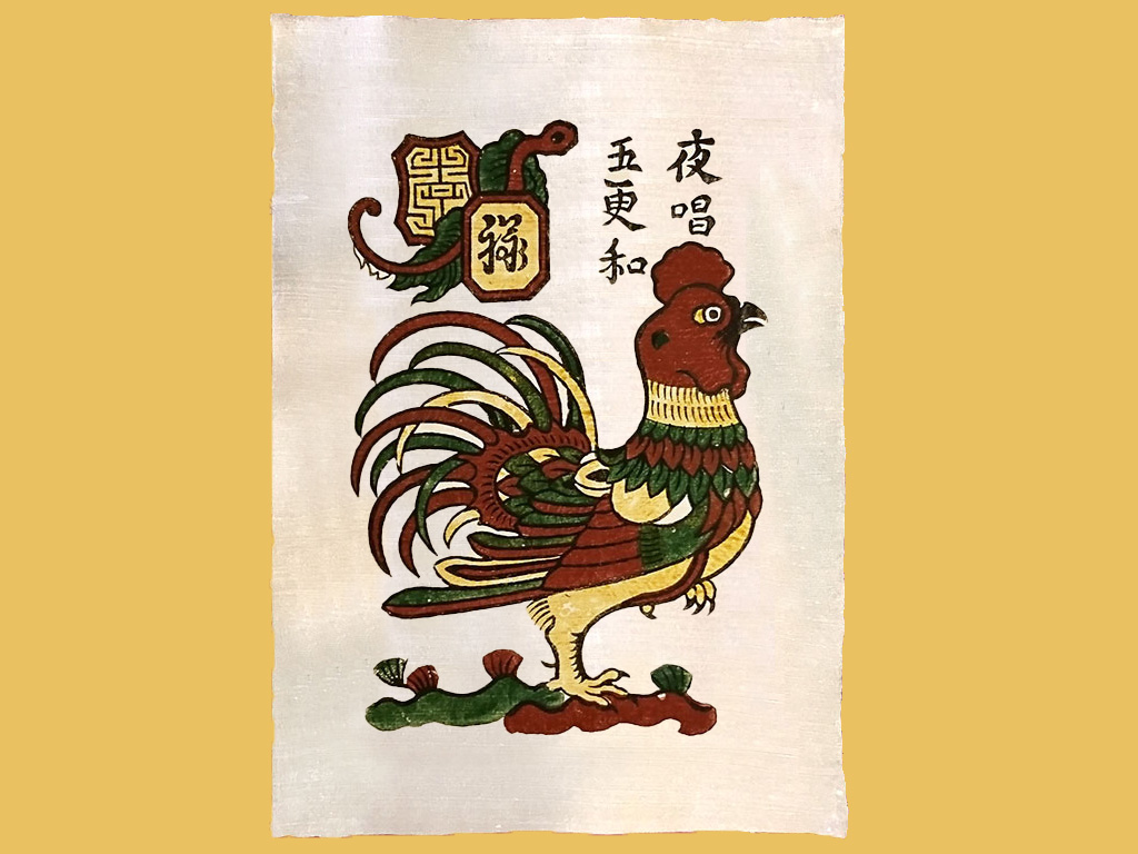 Điều đặc biệt ở bức tranh này là dòng chữ "Dạ xương ngũ canh hòa" tức Đêm Gáy năm canh đều đặn, đó là một câu ca ngợi tính cách kiên định, kiên trì của con gà trống, dù mưa gió hay nắng nó vẫn không ngừng gáy đều đặn cả đêm để báo hiệu cho người chăn nuôi về thời gian.